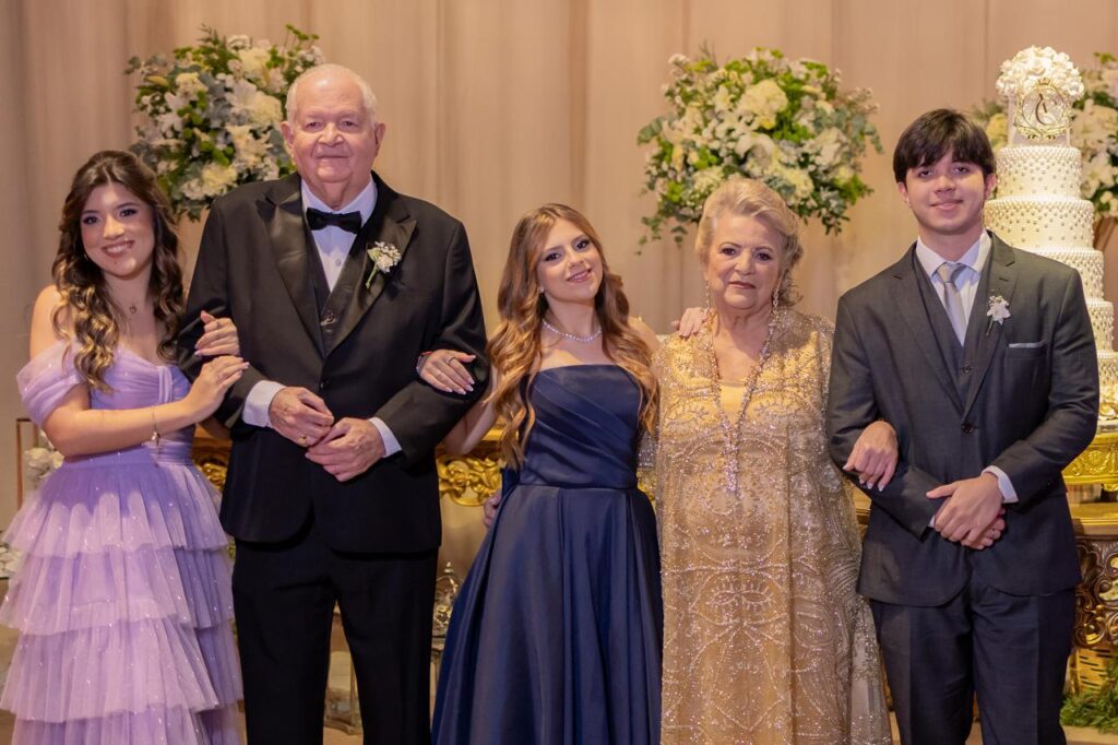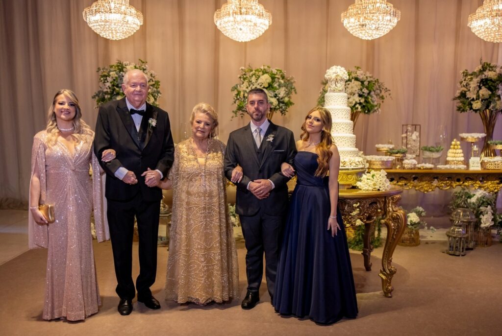 No salão do Ballroom, o casal Carla Correia e Eduardo Fonseca com a filha Ana Clara; e Bruno e Priscila Correia, com os filhos Carlos Bruno e Maria Luísa, filhos e netos dos noivos, receberam elegantemente os convidados.