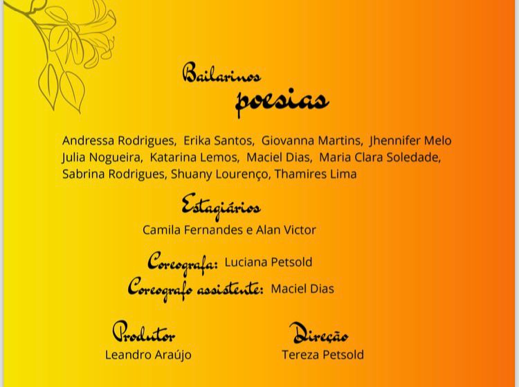 Nas criações icônicas de poetas da literatura e da música brasileira, traduzidas em grandes intérpretes, o público será convidado a despertar emoções em corpos que dançam e fazem, através de suas belas coreografias, a dança das letras, da arte e da poesia.