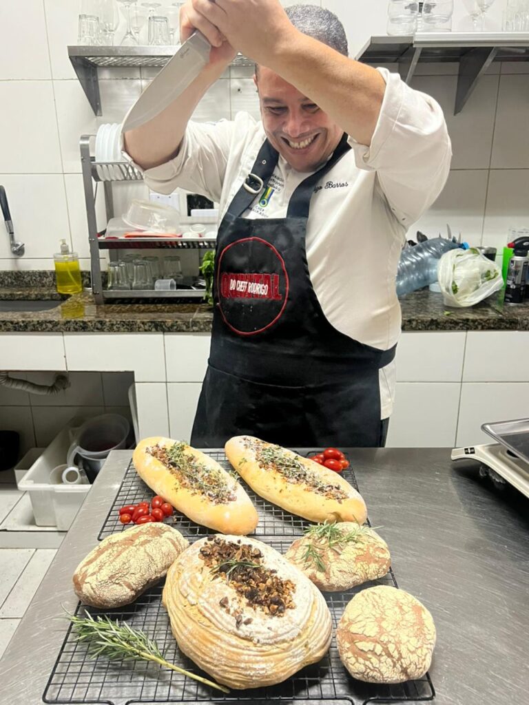 O chef Rodrigo Barros no preparo dos pães italianos.
