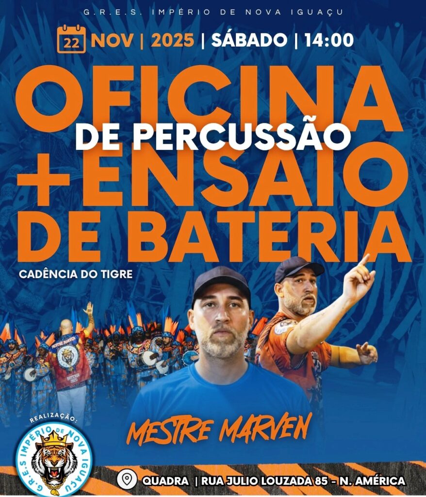 Além do workshop, também haverá inscrições para desfilar na ala de bateria do Império de Nova Iguaçu no Carnaval 2026. A direção da escola reforça que a oportunidade é aberta a novos e antigos ritmistas.