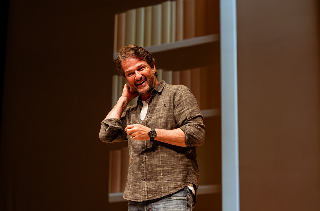 Com humor ácido e toques de autoajuda nada convencionais, o ator entrega ao público um personagem que expõe medos, neuroses e delírios, sem abrir mão da gargalhada.