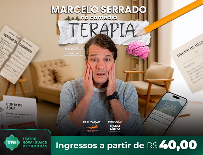 O ator Marcelo Serrado chega amanhã, domingo, 19/01, ao Teatro Nova Iguaçu Petrobras (TNI) com “Terapia”, um espetáculo cômico, visceral e surpreendentemente íntimo.