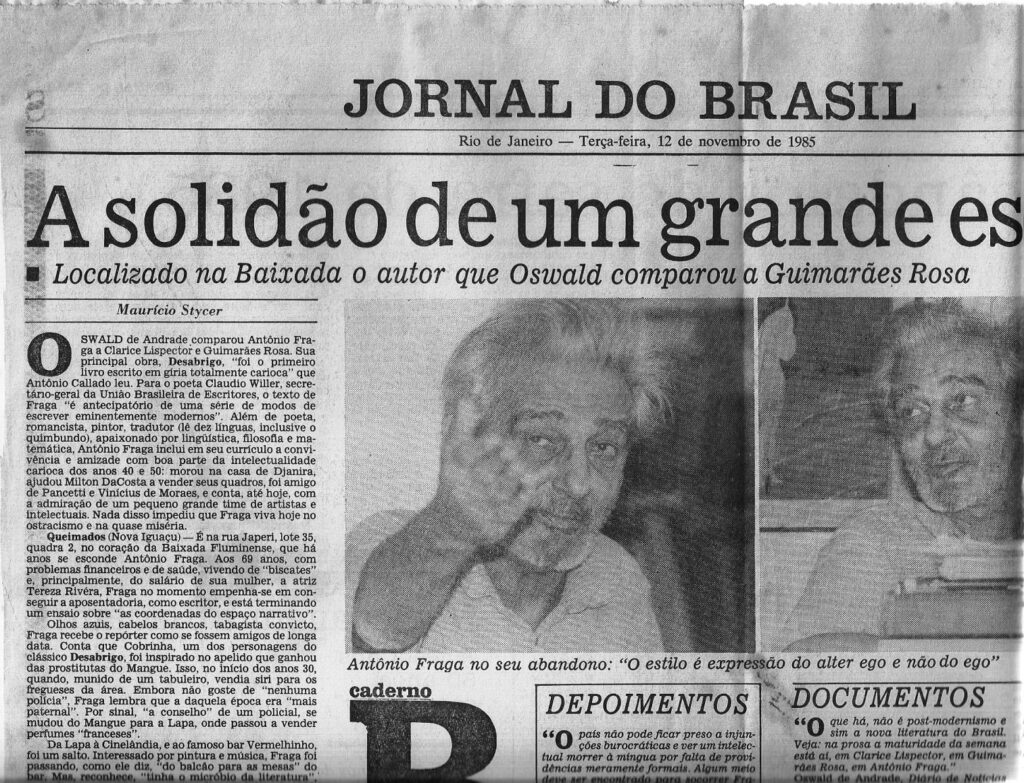 De tamanha importância, o poeta, escritor, advogado, ensaísta e dramaturgo Oswald de Andrade, figura-chave do modernismo no Brasil, comparou Antonio Fraga a Clarice Lispector e a Guimarães Rosa.